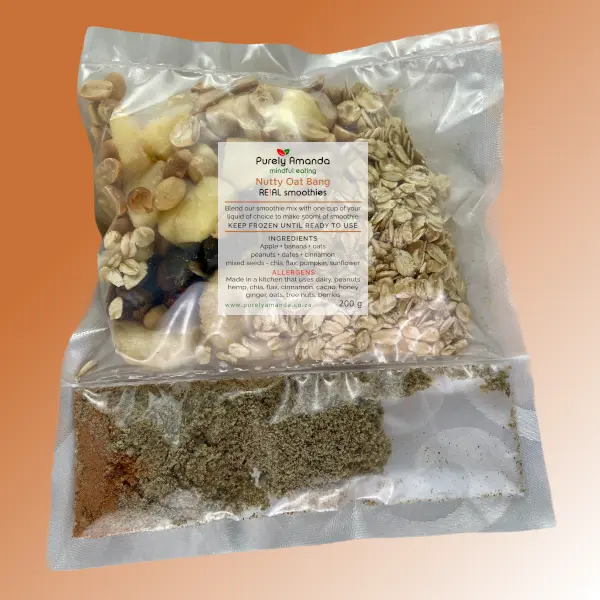 Nutty Oat Bang is an energizing frozen smoothie mix blending apple and banana with a rich base of roasted peanuts, creamy oats, and natural sweetness from dates. It’s crafted for those who crave a heartier, more satisfying smoothie with real fuel.